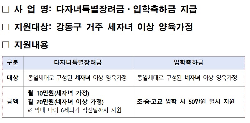 @ 수시접수(신청월 익월 지급) @ 접수처: 관할동주민센터 내방 접수(신분증, 통장사본 지참) @ 문의: 02-3425-7903(길동 복지팀) ㅁ 다자녀특별장려금 - 지원대상: 강동구 동일세대에 자녀 3명 이상과 함께 거주하는 가구 - 지원기간: 신청 익월부터 막내 나이 6세되기 직전달까지 - 지원금액: 3자녀 월10만원, 4자녀 이상 월20만원 ㅁ입학축하금 - 지원대상: 강동구 동일세대에 자녀 4명 이상과 함께 거주하는 가구 - 지원기간: 4째 이상 자녀가 초중고교 입학시 50만원 일시 지원 - 신청방법: 입학 후 1년 이내 관할동주민센터 내방 + 입학 증빙 서류 지참(학교배정통지서 또는 재학증명서) | |||