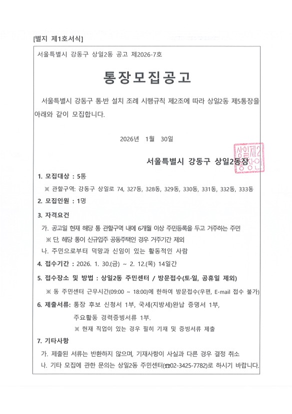 서울특별시 강동구 통반 설치 조례 시행규칙 제2조에 따라 상일제2동 제12통장을 아래와 같이 모집합니다. 1. 모집대상 : 5통 ※ 관할구역: 강동구 상일로 74, 327동, 328동, 329동, 330동, 331동, 332동, 333동 2. 모집인원 : 1명 3. 자격요건 가. 공고일 현재 해당 통 관할구역 내에 6개월 이상 주민등록을 두고 거주하는 주민 ※ 단, 해당 통이 신규입주 공동주택인 경우 거주기간 제외 나. 주민으로부터 덕망과 신임이 있는 활동적인 사람 4. 접수기간 : 2026. 1. 30.(금) ~ 2. 12.(목) 14일간 5. 접수장소 및 방법 : 상일2동 주민센터 / 방문접수(토·일, 공휴일 제외) ※ 동 주민센터 근무시간(09:00 ~ 18:00)에 한하여 방문접수(우편, E-mail 접수 불가) 6. 제출서류: 통장 후보 신청서 1부, 국세(지방세)완납 증명서 1부, 주요활동 경력증빙서류 1부. ※ 현재 직업이 있는 경우 필히 기재 및 증빙서류 제출 7. 기타사항 가. 제출된 서류는 반환하지 않으며, 기재사항이 사실과 다른 경우 결정 취소 나. 기타 모집에 관한 문의는 상일2동 주민센터(☎02-3425-7782)로 하시기 바랍니다. 붙임 1. 공고문 1부 2. 신청서 1부