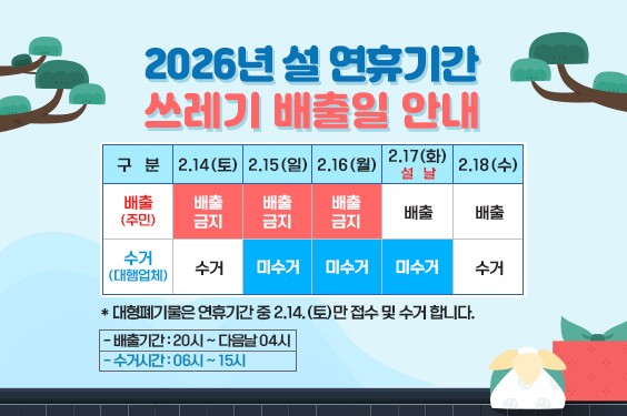 | 제목 | 2026년 설 연휴기간 중 생활폐기물 배출 안내 | ||||||||||||||||||||||||||||||||||||||||||||||||