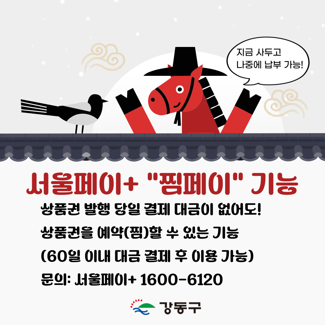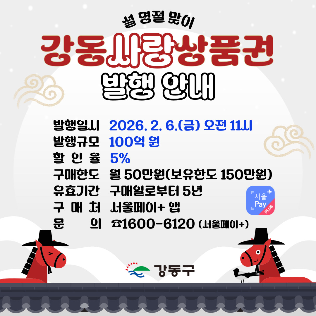 설 명절을 맞이하여 2026년 2월 6일(금) 오전 11시에 강동사랑상품권 100억 원을 5% 할인 판매합니다! 상품권을 이용하여 즐거운 설 연휴 보내세요~ ※ (광역)서울사랑상품권은 2. 11. 발행 예정 ☞ 상품권 구매 및 환불문의 서울페이플러스 고객센터(☏1600-6120) ☞ 서울Pay+ 이용방법 영상 (1편) 서울Pay+ 앱 설치 및 회원가입 https://www.youtube.com/watch?v=5tgUgWj85C0&si=7pnvoY9ynPr7TpUG (2편) 서울Pay+ 앱 상품권 사용법 https://www.youtube.com/watch?v=Ztvwy62gdBA&si=bZ2yLHqIHRGk7K6F ☞ 앱설치 바로가기