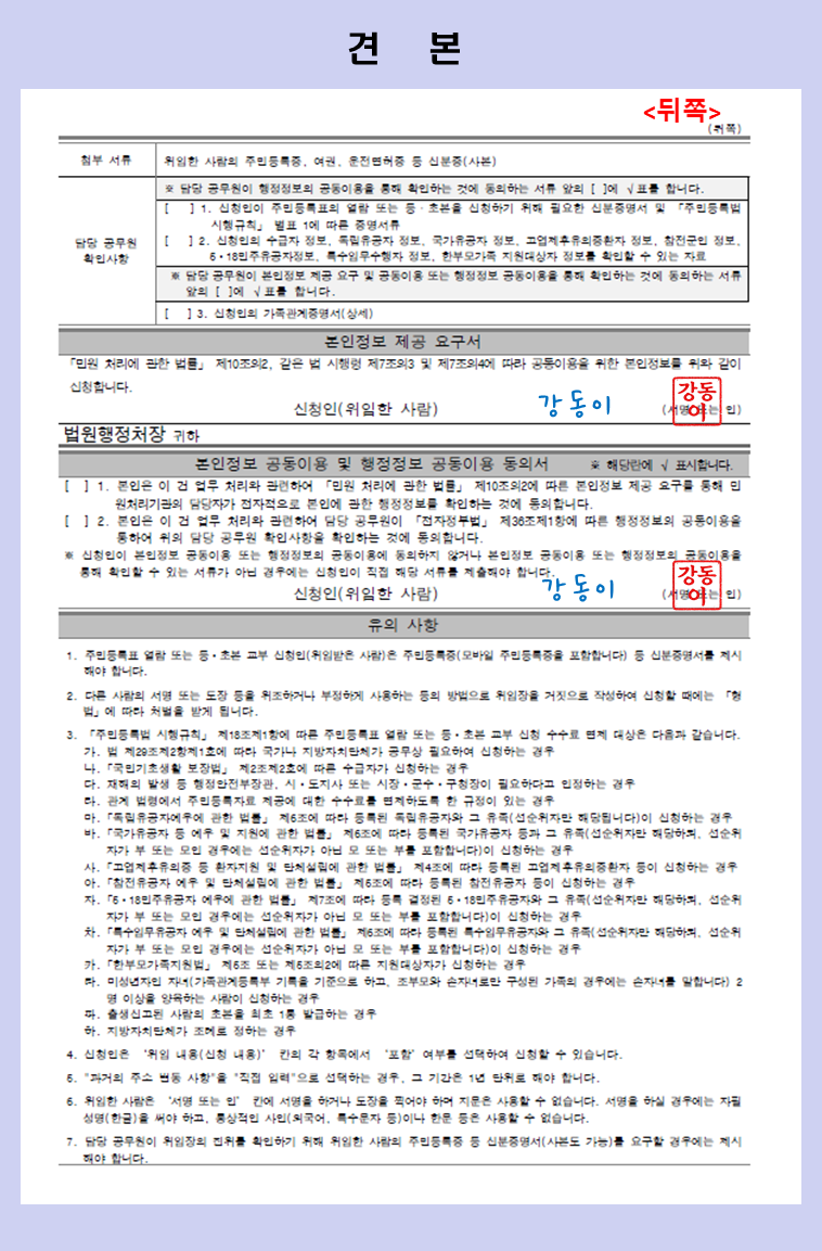 | 제목 | (작성 견본) 주민등록등·초본 신청서(위임용) | ||