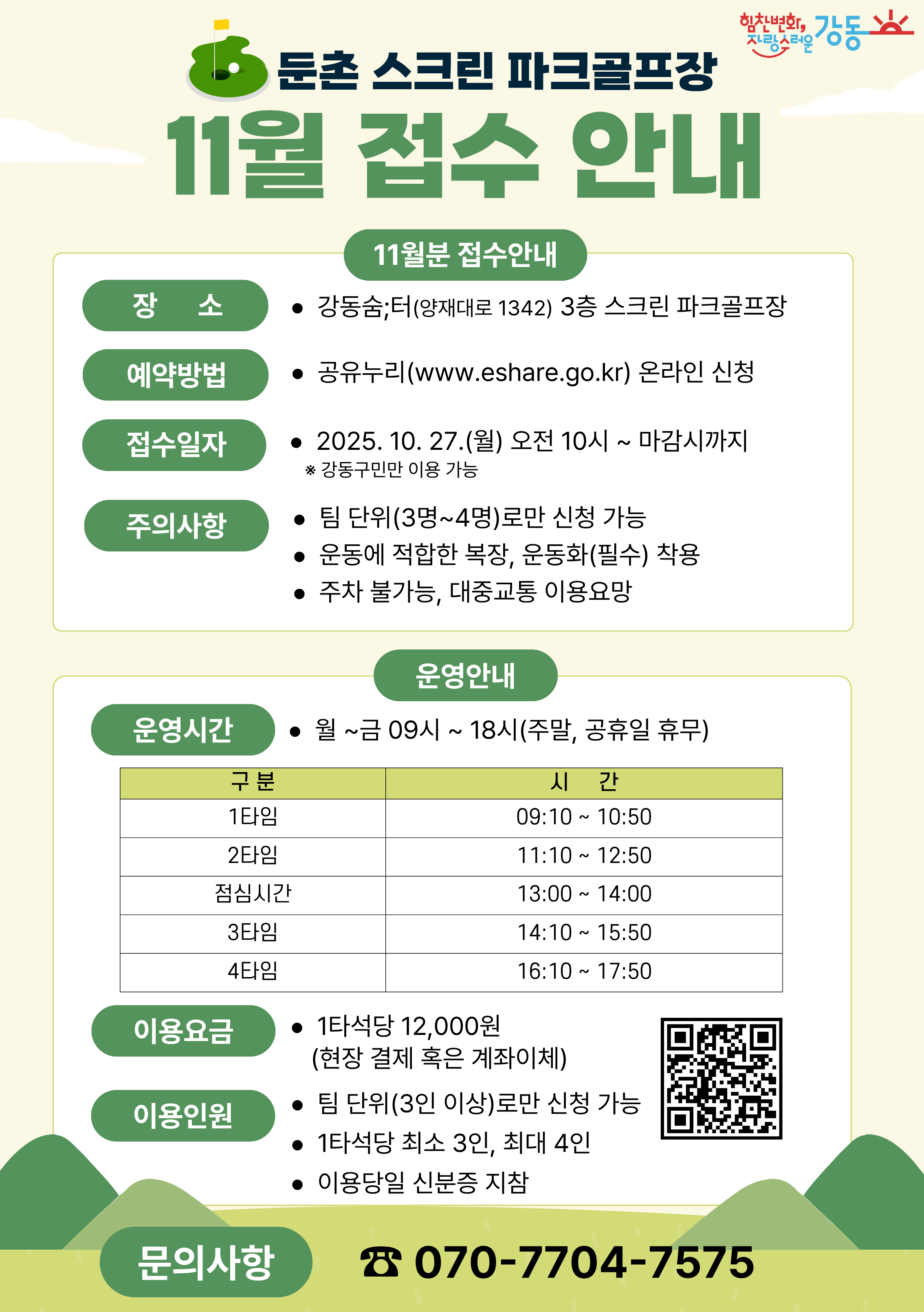 < 둔촌 스크린 파크골프장 11월 접수 안내 > ○ 장 소: 강동숨;터(양재대로 1342) 3층 스크린파크골프장 ※ 둔촌동역 2번출구에서 둔촌파출소 방향 약 200m ○ 대 상: 강동구민 누구나 ○ 접수방법: 공유누리(www.eshare.go.kr) 온라인 접수 ※ 2025. 10. 20.(월) 오전 9시 공유누리 사이트 복구 완료 ※ 홈페이지 링크: ↓↓↓↓아래 사진 클릭↓↓↓↓ ○ 이용인원: 팀 단위(3인 이상)로만 접수 가능 / 1타석당 최소 3인, 최대 4인 ○ 이용요금: 1타석당 12,000원(계좌이체 혹은 현장 카드결제) ○ 접수기간: 2025. 10. 27.(월) 오전 10시 ~ 마감시까지 ※ 강동구민만 접수 가능 ○ 주의사항 - 운동에 적합한 복장, 운동화(필수) 착용 - 장비(파크골프채, 장갑 등) 개별 지참 가능 ※ 파크골프채 대여 가능(회당 1,000원) - 주차 불가능, 대중교통 이용요망 - 이용 당일 신분증 지참 ※ 세부 안내 사항은 공유누리에서 반드시 확인해주시길 바랍니다! |