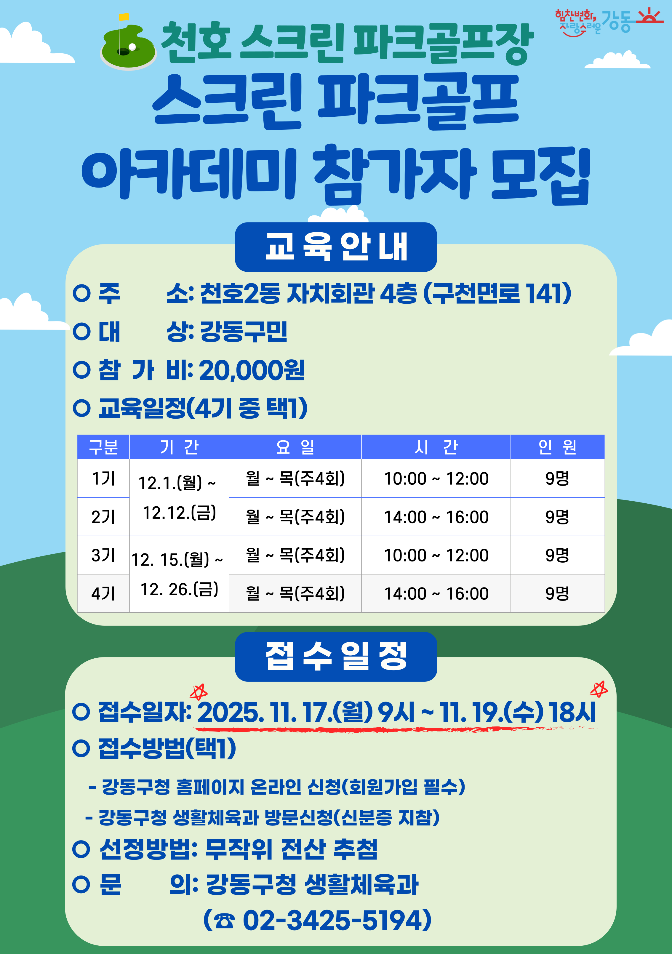 <접수일정> ○ 접수일자: 2025. 11. 17.(월) 9시 ~ 11. 19.(수) 18시 ○ 접수방법(택1) - 강동구청 홈페이지 온라인 신청(회원가입 필수) - 강동구청 생활체육과 방문신청(신분증 지참) ○ 선정방법: 무작위 전산 추첨 ○ 문 의: 강동구청 생활체육과(☎ 02-3425-5194)