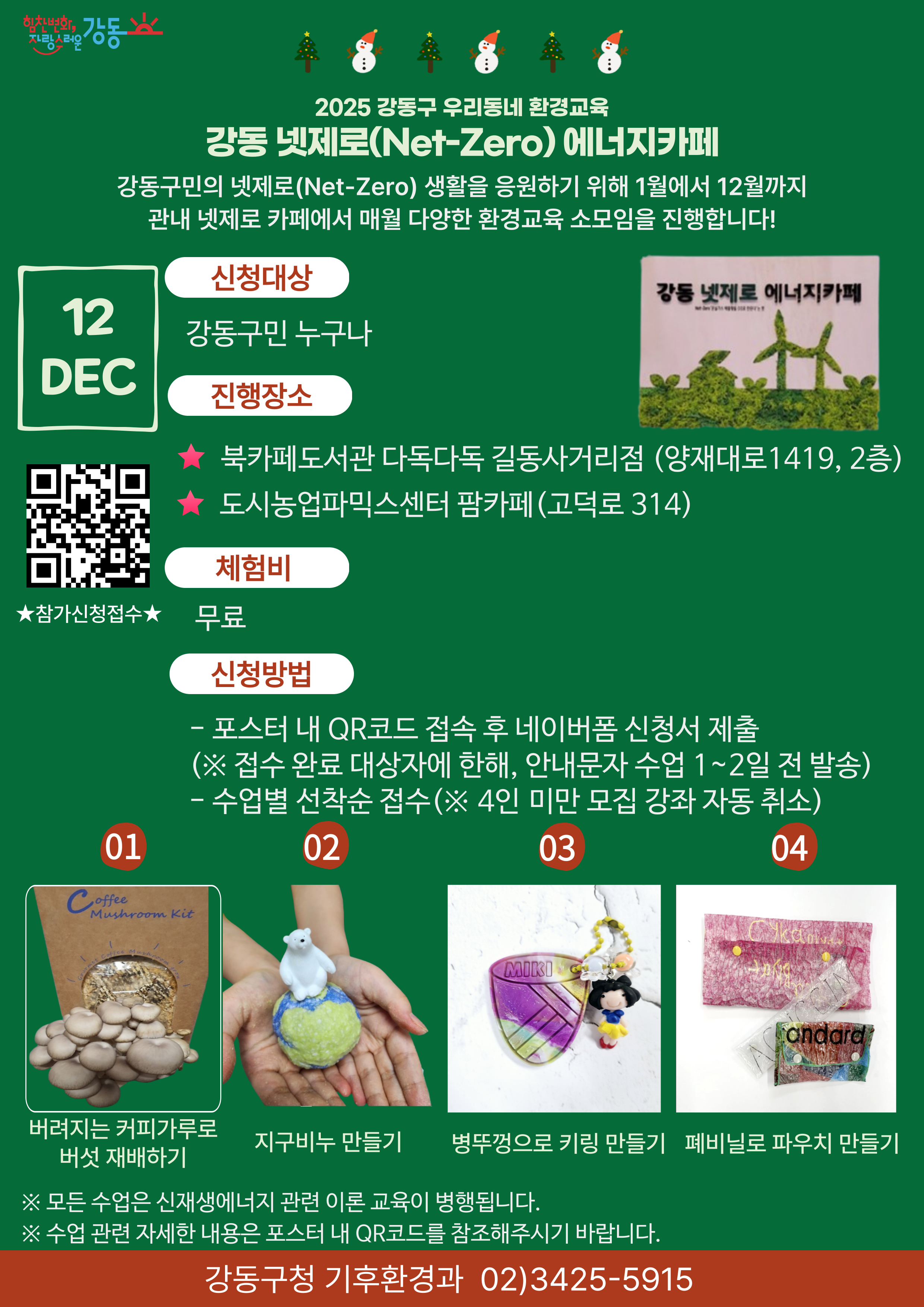 3. 체험비: 무료 4. 신청방법 : 포스터 내 QR코드 또는 https://naver.me/xpBnLlBW 접속 후 신청서 제출 (※ 노쇼 시, 차후 환경교육 프로그램 신청 제한) 5. 문의: 강동구청 기후환경과(02)3425-5915) |