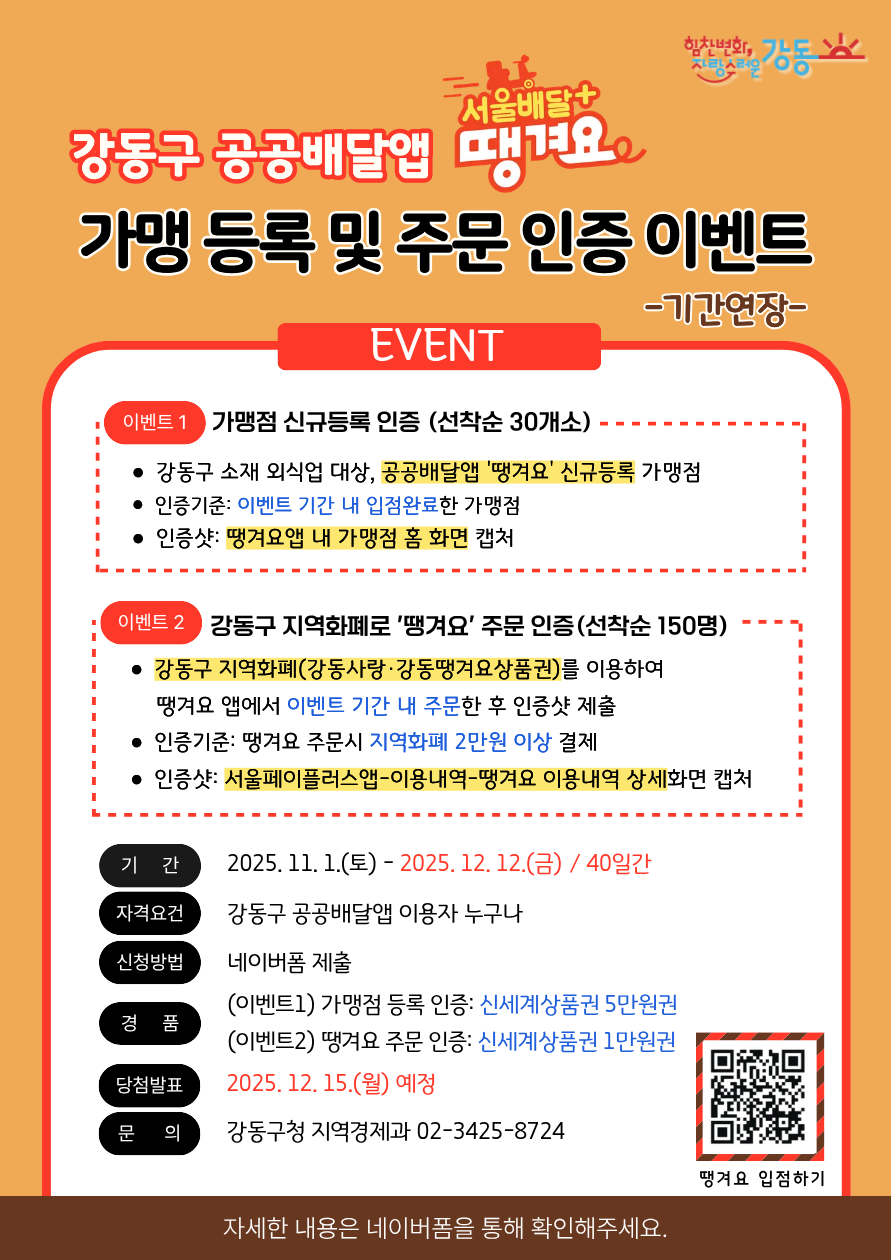 | 제목 | 서울배달플러스 땡겨요 이벤트 기간연장 안내(11.1.(토) ~ 12.12.(금)) | ||