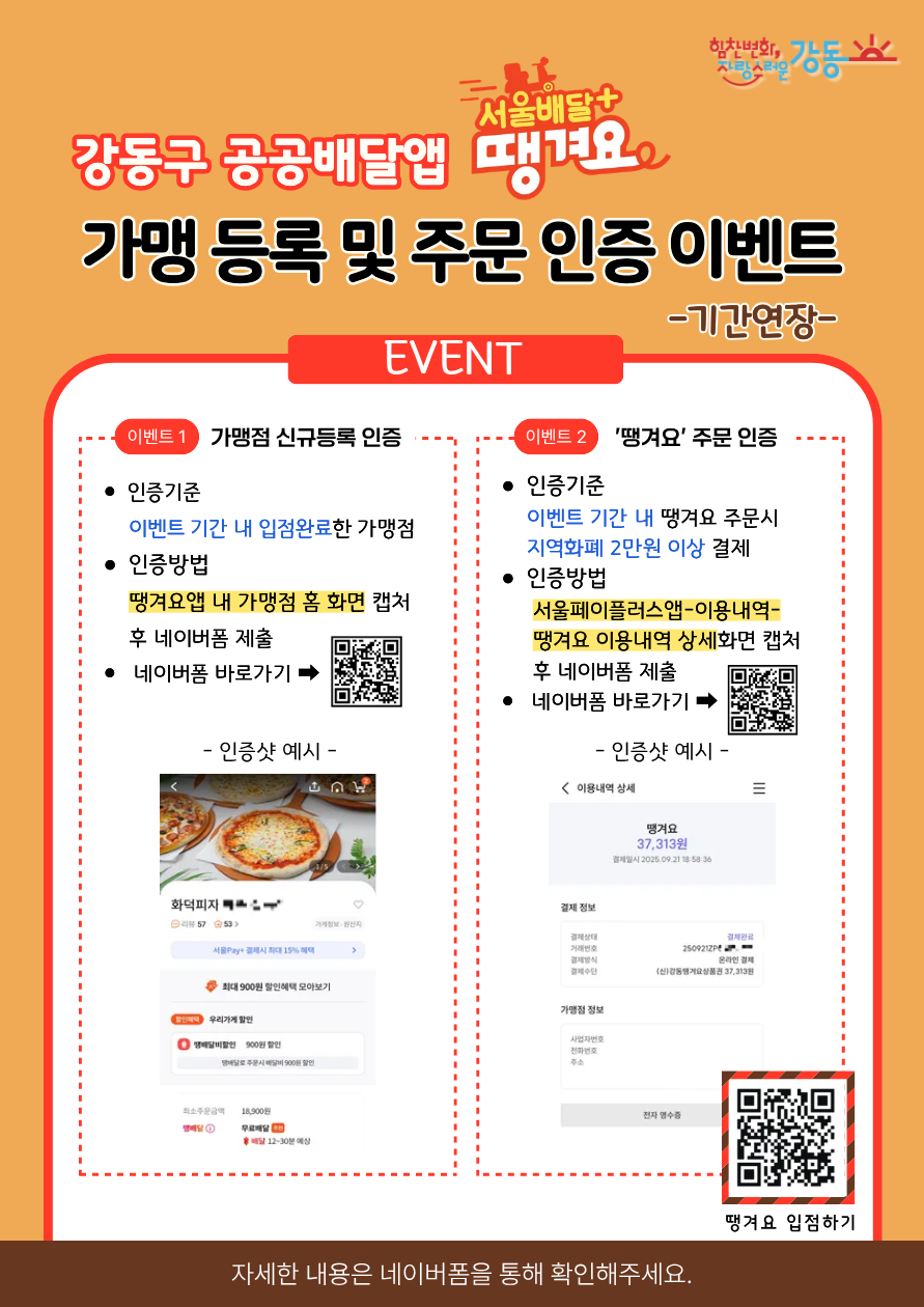 지금 바로 참여하기! * 이벤트 1: 가맹점 신규등록 인증 * 이벤트 2: 땡겨요 주문 인증(※ 지역화폐 결제금액 2만원 이상) |
