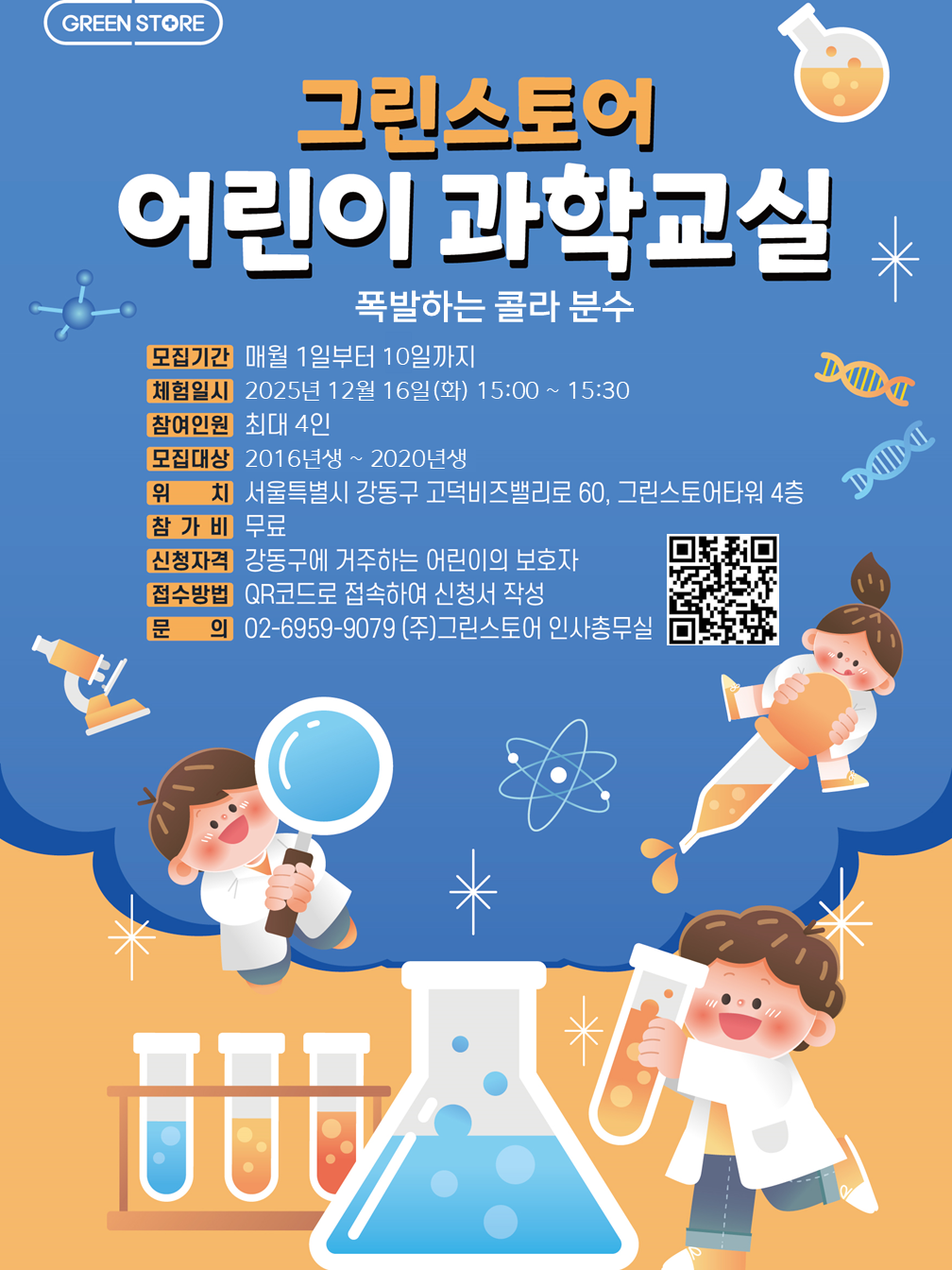 고덕비즈밸리 입주기업 ㈜그린스토어에서 주관하여 진행하는 “어린이 과학교실”의 12월 신청자를 모집하오니 주민 여러분의 많은 관심과 참여 부탁드립니다. <12월 체험: 폭발하는 콜라 분수> ○ 모집기간: 12월 10일까지 ○ 체험일시: 2025년 12월 16일(화) 15:00 ~ 15:30 예정 ○ 위 치: 강동구 고덕비즈밸리로60, 그린스토어타워 4층 ○ 모집대상: 2016년생 ~ 2020년생 ※ 최대 4인 모집 ○ 신청자격: 강동구에 거주하는 어린이의 보호자 ○ 신청방법: 포스터 내 QR코드 접속하여 신청서 작성 ○ 참가비용: 무료 ○ 문의번호: 02-6959-9079 (주)그린스토어 인사총무실 자세한 사항은 포스터 참고 바랍니다!
