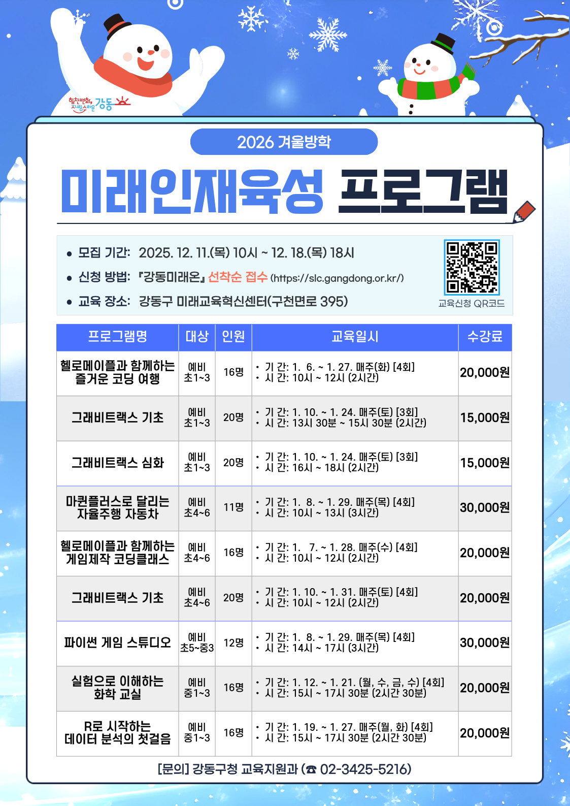 ★2026년 겨울방 미래인재육성 프로그램 개강★강동구 청소년을 위한 알차고 재미있는 프로그램이 찾아왔습니다! ▶ 강동구 학생: 강동구에 거주하거나, 강동구 소재 학교에 재학 중인 학생 ※ 예비학년 기준(2026학년도 기준)으로 모집합니다. ▶ 신청 바로가기: https://slc.gangdong.or.kr/?m1=page&menu_id=208 ▶ 문의: ☎02-3425-5216