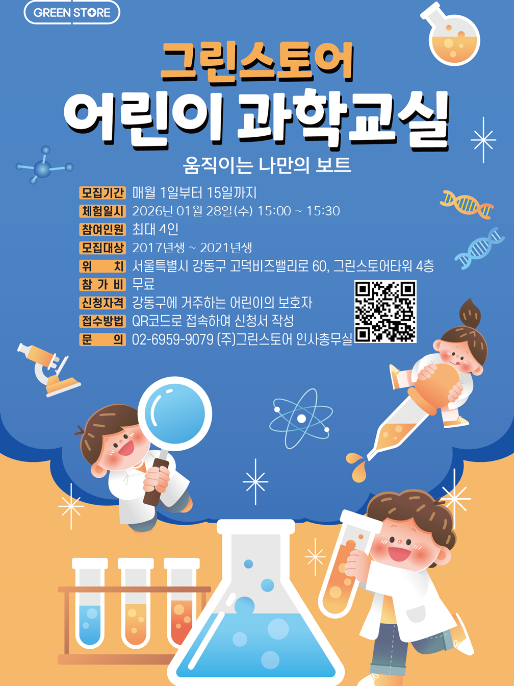 고덕비즈밸리 입주기업 ㈜그린스토어에서 주관하여 진행하는 “어린이 과학교실”의 1월 신청자를 모집하오니 주민 여러분들의 많은 관심과 참여 부탁드립니다. <1월 체험: 움직이는 나만의 보트> ○ 모집기간: 매월 1일부터 15일까지 ○ 체험일시: 2026년 1월 28일(수) 15:00 ~ 15:30 예정 ○ 위 치: 강동구 고덕비즈밸리로60, 그린스토어타워 4층 ○ 모집대상: 2017년생 ~ 2021년생 ※ 최대 4인 모집 ○ 신청자격: 강동구에 거주하는 어린이의 보호자 ○ 신청방법: 포스터 내 QR코드 접속하여 신청서 작성 ○ 참가비용: 무료 ○ 문의번호: 02-6959-9079 (주)그린스토어 인사총무실 자세한 사항은 포스터 참고 바랍니다!