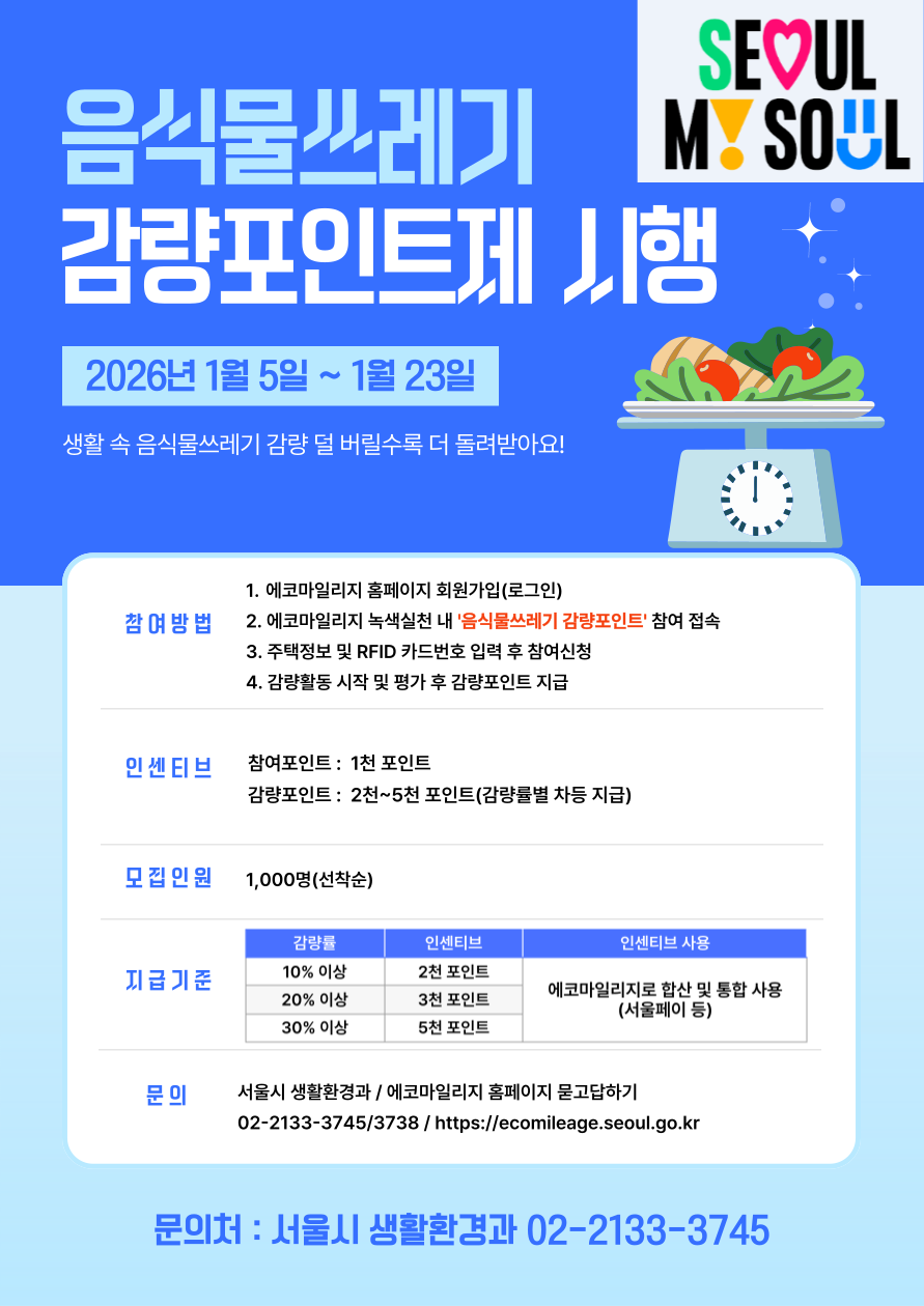 2026년 서울시에서 시행하는 음식물쓰레기 감량 포인트제입니다. RFID종량기로 음식물 쓰레기를 배출하시는 세대에서 온라인으로 신청 후 음식물 쓰레기 배출량을 감량하시면 에코마일리지 포인트를 받으실 수 있습니다. 참여자 전원 1천 포인트를 지급하니 관심있으신 분들의 많은 신청 바랍니다.