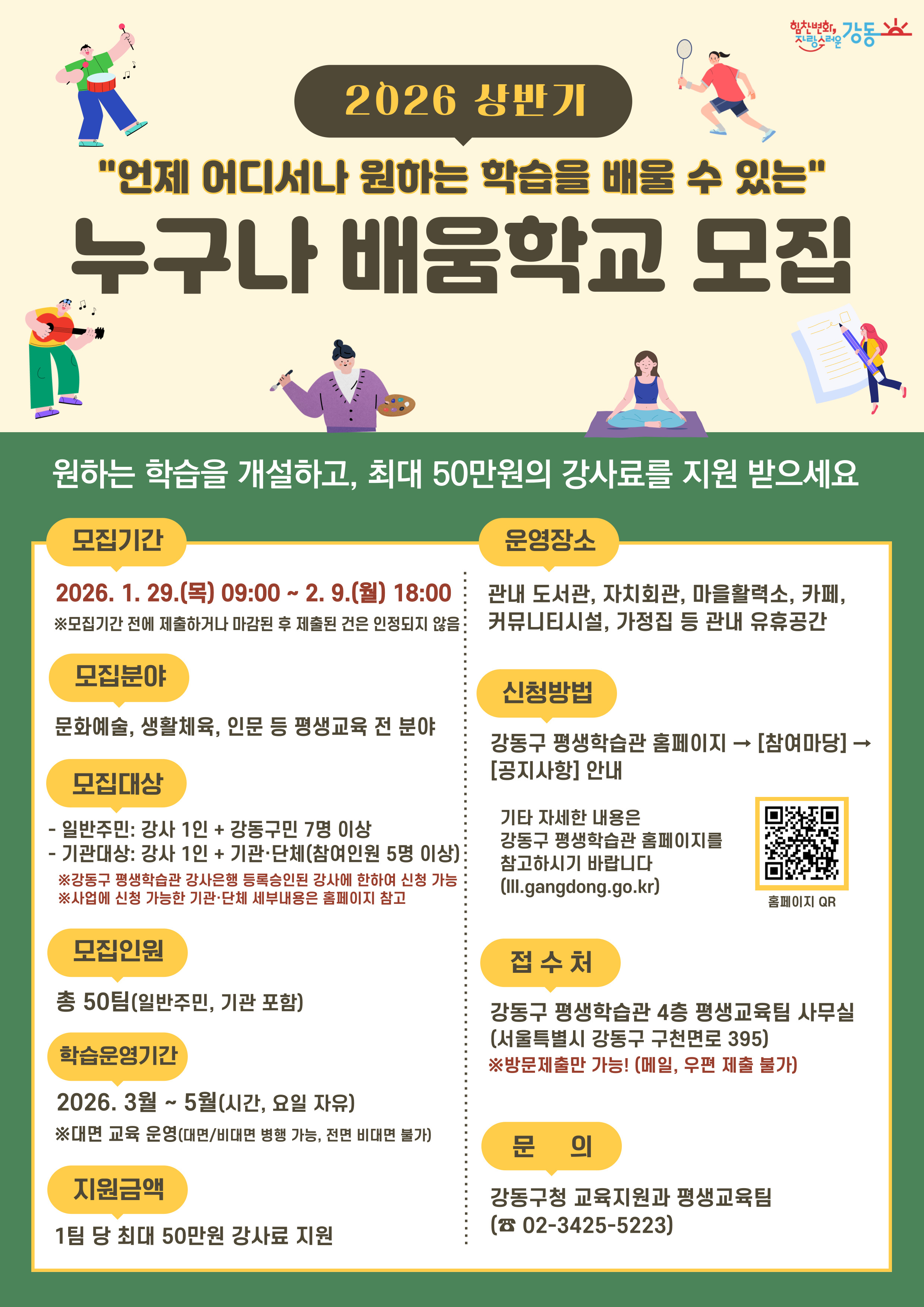 2026. 상반기 찾아가는 평생학습 '누구나 배움학교' 참여자 모집 찾아가는 평생학습 「누구나 배움학교」는 ‘강사 1인과 강동구민’이 한 팀을 이뤄서 배우고 싶은 평생학습 분야와 시간·장소를 직접 계획하여 신청서를 제출하면, 심사를 통해 학습 지원을 받으실 수 있는 평생학습 사업입니다. 해당 사업에 관심있으신 분들의 많은 신청바랍니다.