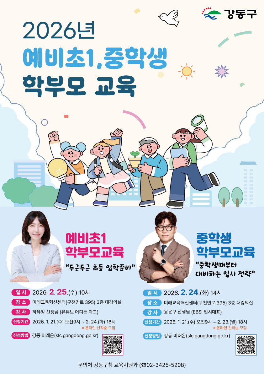 < 2026. 예비초1, 중학생 학부모 특강 개최 > 2026. 새 학기를 맞이하여 예비초1, 중학생 학부모를 대상으로 학부모 교육을 개최하오니, 관내 학부모님들의 많은 관심과 참여 부탁드립니다. ※ 신청처: 강동 미래온(slc.gangdong.or.kr?m1=page&menu_id=209)