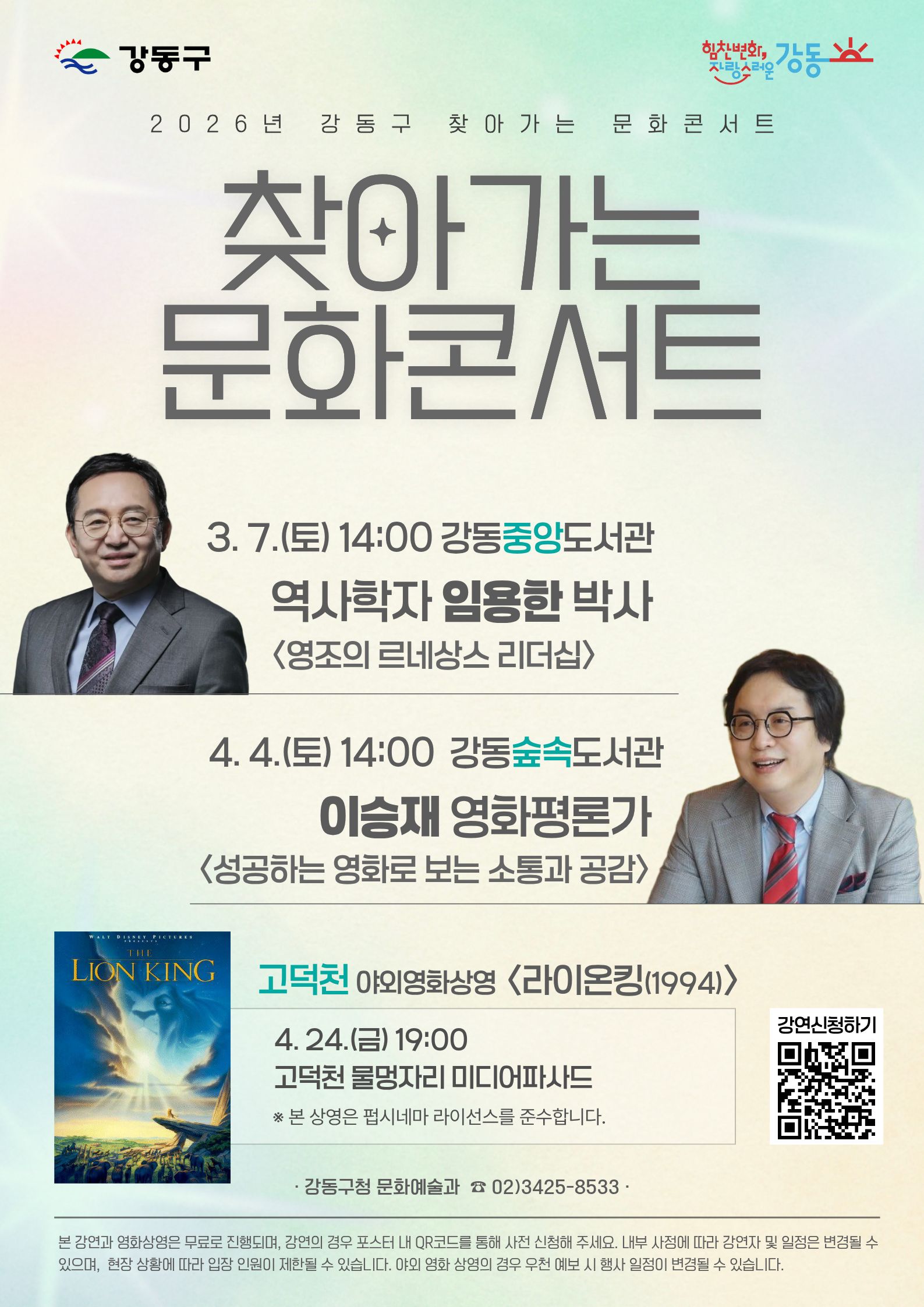 - 모집기간: 2026. 2. 23.(월) 10:00~마감 시까지(선착순) - 모집대상: 지역주민 250여 명 - 신청방법: 온라인 사전접수 ☞ 포스터 내 QR코드 스캔 후 신청서 작성 [2. 23.(월)부터 작성 가능] (신청URL) https://naver.me/GFsQin5w - 주차안내: 주차공간이 협소하오니 대중교통을 이용하여 주시기 바랍니다. -문의: 강동구청 문화예술과 02-3425-8533 * 2회차 강연 신청은 2026. 4. 23.(월) 강동구청 홈페이지 '강동소식'을 통해 별도 공지 예정입니다.