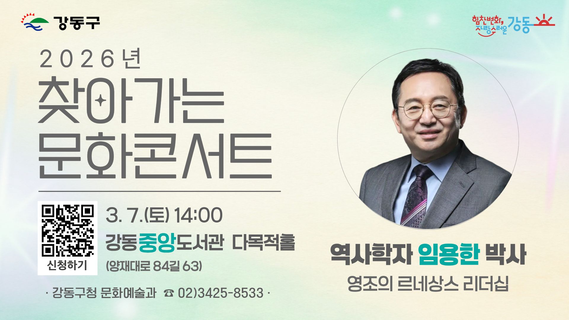 | 제목 | <2026년 강동구 찾아가는 문화콘서트> 1회차 역사학자 임용한 박사 강연 신청자 모집 | ||